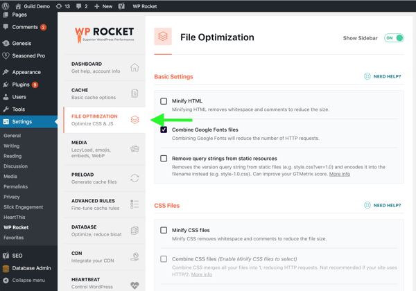 1. Login to WordPress and click on Settings and then select WP Rocket.